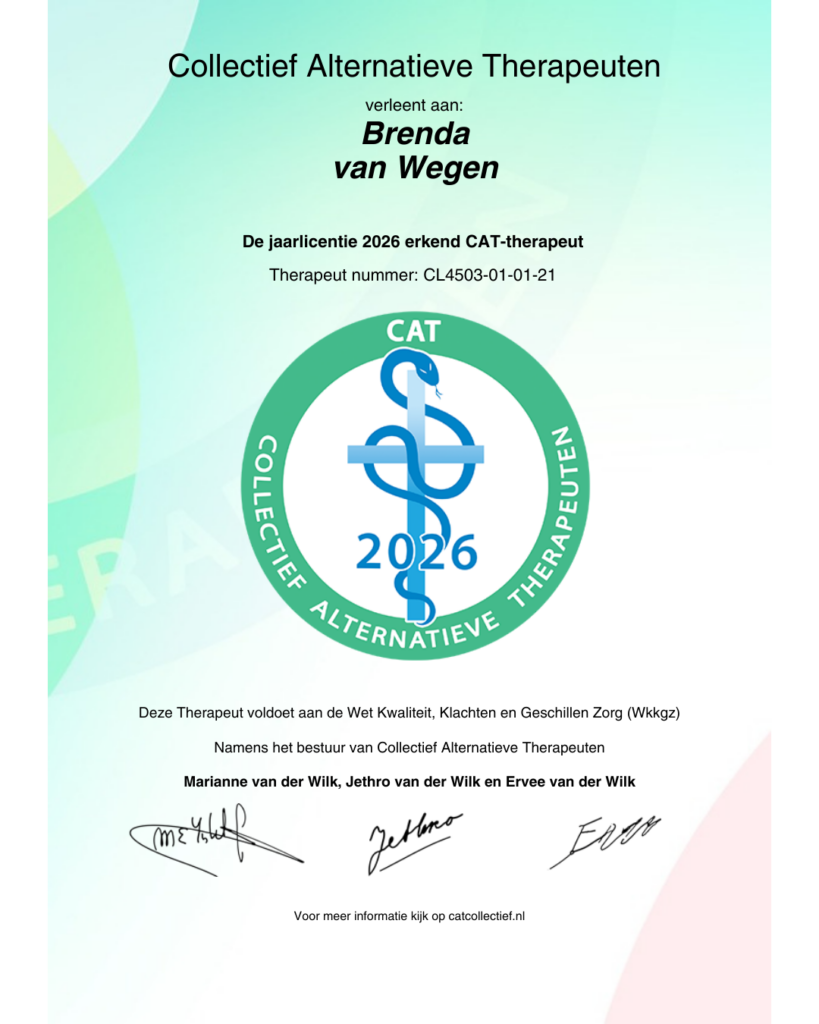 Ik ben aangesloten bij CAT, een multidisciplinaire beroepsorganisatie voor alternatieve therapeuten en voldoe aan de CAT-kwaliteitsstandaarden.